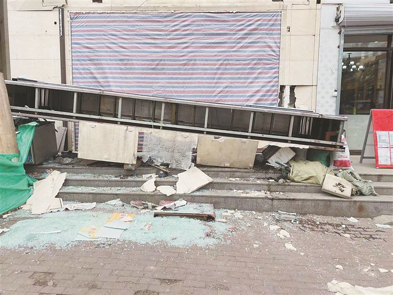 生活报记者在现场看到,一个大型牌匾坠落在门市房门前,牌匾一侧搭在冰柜上,另一侧搭在了胶丝袋子上,地面上还有玻璃碎片,伤者已被送往医院救治。