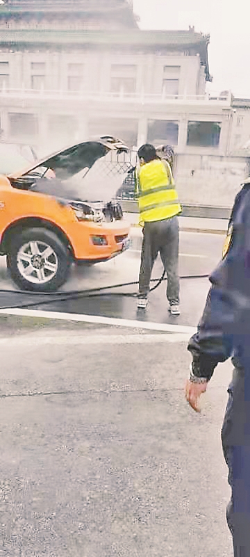 “快拿灭火器!快救火!”几人一路狂奔拿着灭火器冲到失火车辆跟前,用平时公交公司培训掌握的救火技能进行扑救。