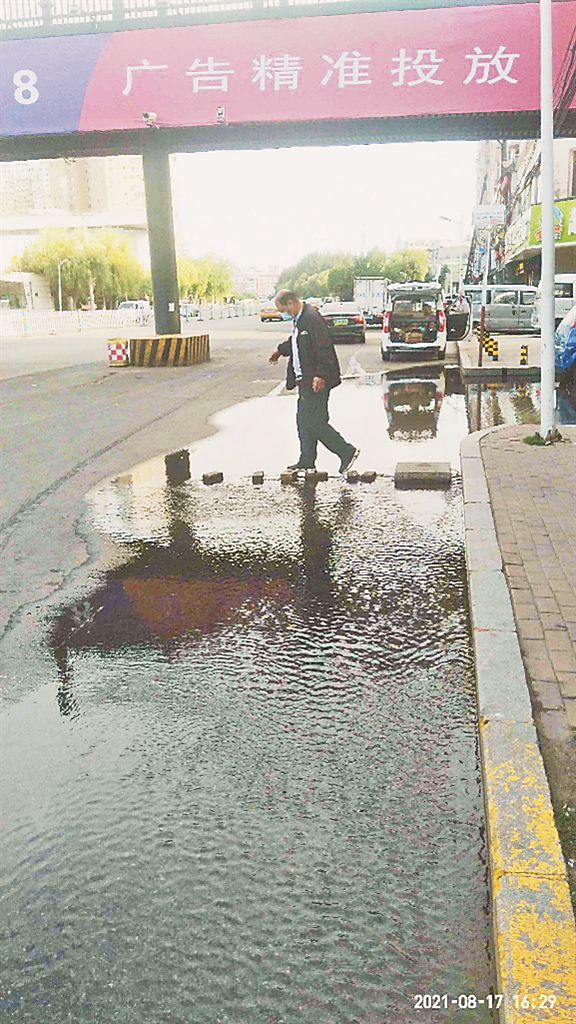 记者看到,红旗大街上的水流已经形成了一条宽达两米左右的小河,沿街商家都在马路牙子下放了砖头,以方便行人。