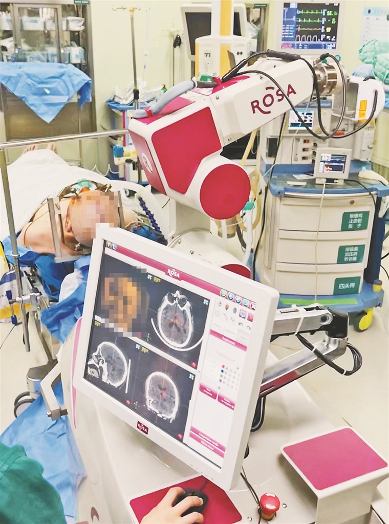 “通过手术在他脑中植入电极,通过脉冲的刺激,帮助纠正大脑中异常放电的核团,从而达到治疗的效果。”为了更加精准地实施手术,采用的是最先进的ROSA“机器人”辅助微创技术,联同Bis监测术中唤醒技术全程监测孙先生的麻醉深度,以及术中神经电生理监测技术,精准无误地将两根细小的刺激电极植入孙先生的大脑深部核团,通过皮下潜行,将电极妥善连接埋入锁骨下方直径仅为5cm的脉冲发生器。“这样通过持续发放电脉冲,调节患者的神经环路,可以控制患者身体的异常扭动等症状。”王海洋说。果然,孙先生术后不自主扭动和异常运动明显缓解,不用他人搀扶可以独立下床活动,这样的效果让他的家人惊喜万分。