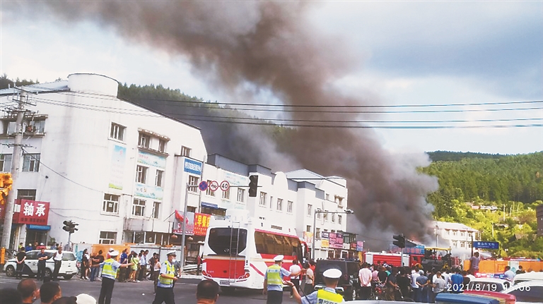 视频显示,火灾附近有群众围观,交警正在维持交通,消防人员指挥铲车把工棚铲开一个口子,方便灭火。