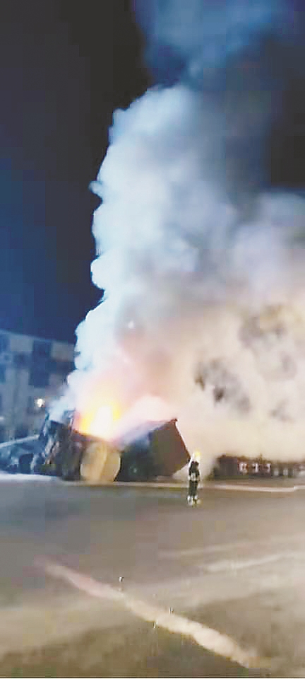 生活报24日讯 (记者肖劲彪) 24日凌晨1时左右,在哈尔滨市道外区天恒大街438号路段,一辆翻斗车和水泥罐车相撞,殃及路旁停放的三辆机动车,造成多车受损起火,两人受伤被送往医院救治。
