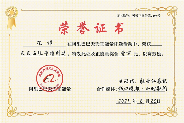 阿里巴巴天天正能量联合生活报、牡丹江晨报、钱江晚报·小时新闻授予张洋天天正能量特别奖及1万元正能量奖金。当陌生人遭遇危难之际,他用大爱义举给出了最温暖的答案。一往无前、救人第一的信念背后,是善的本能和勇敢。热血善行,尽显男儿本色,为他点个大大的赞!