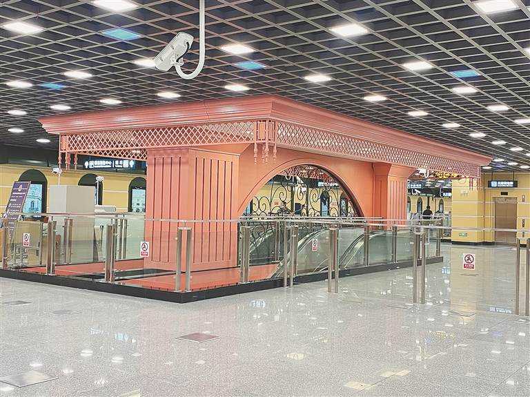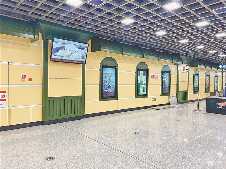在站厅人流密集的楼梯处,将欧式的藻井元素以及彩绘图案的灯具运用到了棚顶的设计当中,又搭配了欧式的铁艺窗花,更加凸显欧式韵味。地铁站临时站长王珍介绍说:“中央大街的建筑风格是通过着重考量的,使高贵、典雅、时尚的中央大街融入到地铁车站当中。通过墙面上31块流动的电子屏,让游客和乘客更加热爱冰城,并欣赏琉璃的夜色。”