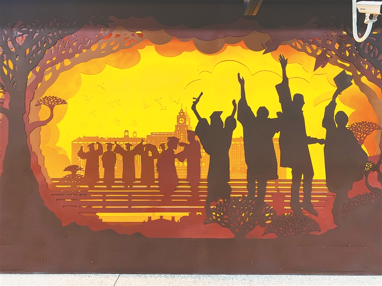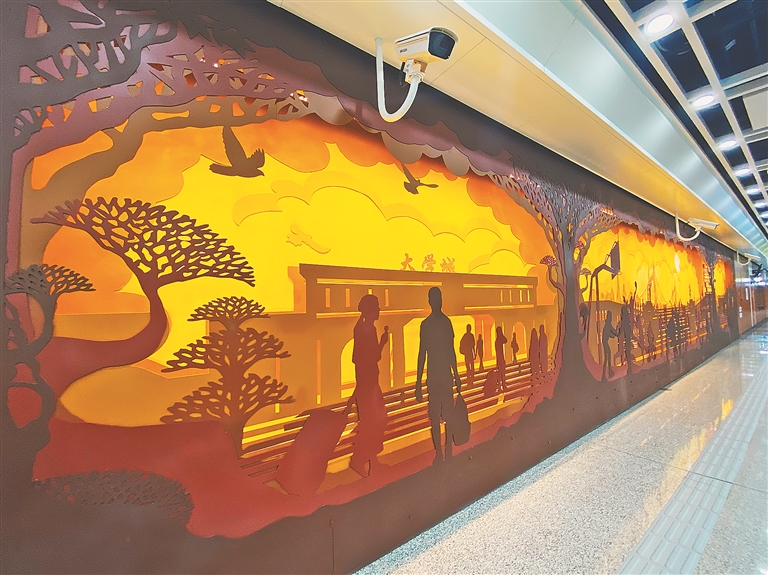 江北大学城站紧邻附近10多所大学,总人数达到了十余万人,约为大学城附近总人口的二分之一。江北大学城地铁站的开通将给附近居民和学生提供了极大的便利。生活报记者走进地铁站,映入眼帘的是一幅近20米长的文化墙。文化墙以“青春光影”为设计理念,描绘出了大学生涯的几个阶段。首先是学生初入校园时的青涩,然后是校园丰富的文体活动以及永攀书峰的钻研,到毕业季学生对未来的美好憧憬。再搭配泛黄的灯光,展现出时间的厚重感,增加了文化墙的故事性。王珍表示:“青春是一本太过仓促的书,我们希望这里成为学生打卡地的同时,也可以让这本青春的书翻得慢一点,为他们的青春留下美好的瞬间。”