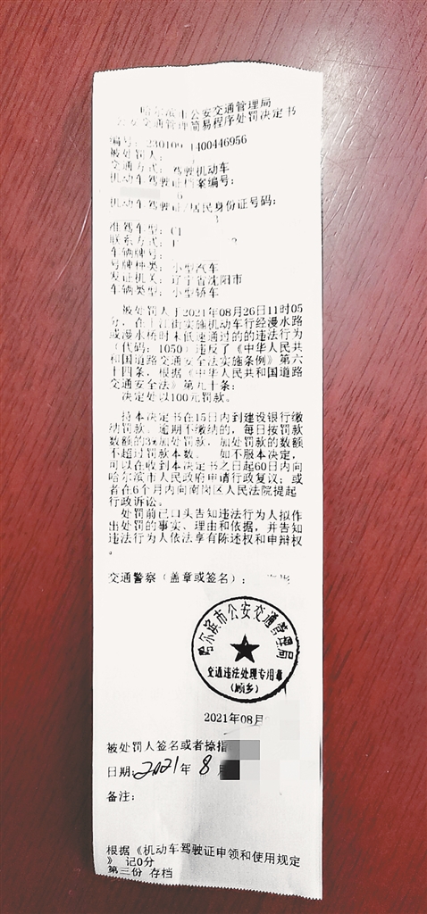25日,王女士向顾乡交警队提供了行车记录仪记录下的完整视频。26日,交警部门将当事车辆驾驶员传唤至交警队,向其开出罚单。记者看到,罚单上明确写道:车牌号为黑A205GW的小型轿车“在上江街实施机动车行经漫水路或漫水桥时未低速通过的违法行为(代码1050)违反了《中华人民共和国道路交通安全法实施条例》第六十四条,根据《中华人民共和国道路交通安全法》第九十条:决定处以100元罚款。”