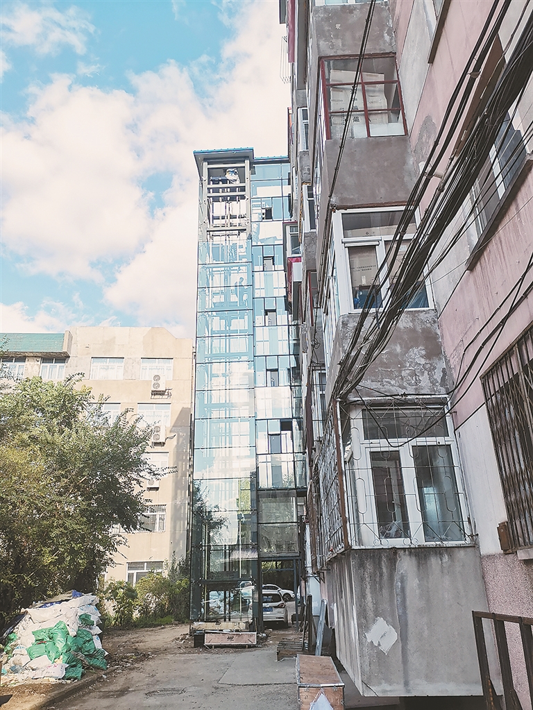 30日,生活报记者来到南岗区哈工大二校区建工小区看到,该小区15号楼在原本单元入户门的地方安装了透明玻璃的观光电梯;在14号楼2单元和4单元已经安装了电梯的内部装置,有施工人员在进行作业。