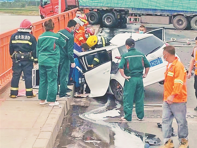 目击者赵先生表示,现场一辆满载货物的挂车与一辆白色丰田轿车、还有一辆农用四轮车发生相撞,驾驶员被困车内,消防员将其救出,经120急救人员确认当场死亡。挂车撞坏桥护栏,驾驶室悬在半空,农用四轮车在货车右侧受损,车内两人被困,消防员将货车后方玻璃击碎将两人救出。