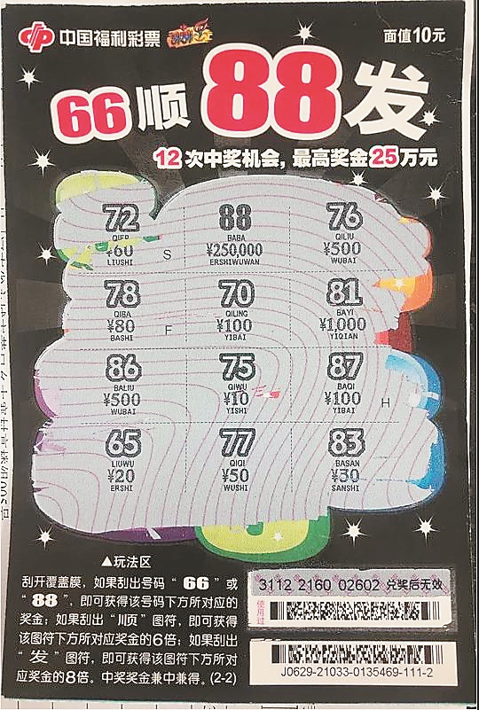中奖彩民家住张家港市,经常前往该福彩投注站购彩,平时喜欢投注双色球和3D玩法,其中购买频率最高的是刮刮乐。刮刮乐是即开型彩票,刮开覆盖膜,中不中奖一目了然,即开即兑。他就是看中刮刮乐玩法简单、有趣,所以时不时地会去站点刮几张。8月19日晚,他晚饭后又来到该站点,在多种刮刮乐产品中选中了10元面值的“66顺88发”,先买了5张,刮开未中奖,又买了1张,依旧未刮出奖金金额较大的奖。于是,他对站点销售员说,再刮最后1张,如果还不中就不刮了。结果当他刮开第7张票时,“玩法区”第一行就出现号码“88”,他仔细一看数字下方对应的奖金是“¥250,000”,连忙拉着销售员核实是否真的中了大奖,得到肯定答案后,他开心极了。