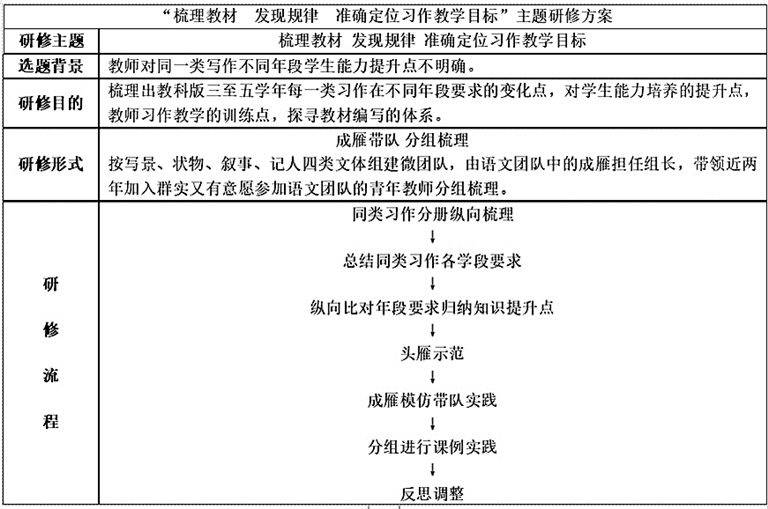 接着团队开始精心设计课题实施方案,确保每一个主题研修顺利有序地开展。(图一)就是团队进行习作主题研修时设计的研究方案,我们以“成雁带队分组梳理”为研修形式,分七个流程,有梯度开展活动。这个方案,一方面是从研修需要出发,同时也蕴含着人文因素,通过此次研修,微团队的领衔人齐广贺、李佳蓉、张颖、魏艳杰等成熟型教师的工作热情被再次点燃,顺利度过职业的倦怠期和瓶颈期。