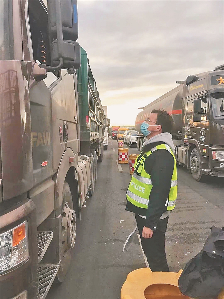 她的爱人梁旭也加入到六顺街道核酸检测的秩序维护工作中,并且在夜间驻守朝阳出城口,配合开展入城检查、劝返车辆工作。
