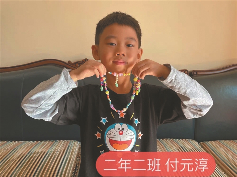 课堂上,同学们仔细聆听老师的讲解,从小小的朝珠中学习到了丰富的历史文化知识。在动手制作朝珠环节,大家根据所听、所学自行设计,独立完成一件件精美的作品。