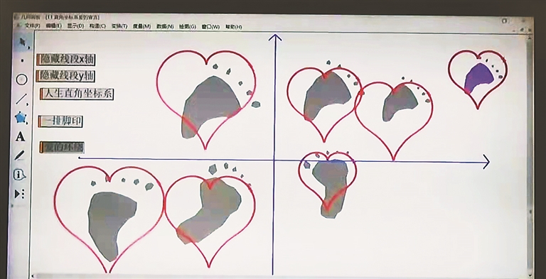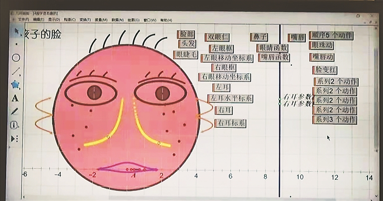 他用几何画板把数学题变成了一幅幅生动的图像,再利用画板的动态演示,把难点用图像的方式呈现出来,于是,他的课堂上就出现了这样的场景:“同学们的脸就相当于圆,眼睛就相当于椭圆,耳朵呢,就相当于两个三角函数,我们用数学函数画出的图像,可能没有美术老师画得漂亮,但是我们的图像可以运动……”