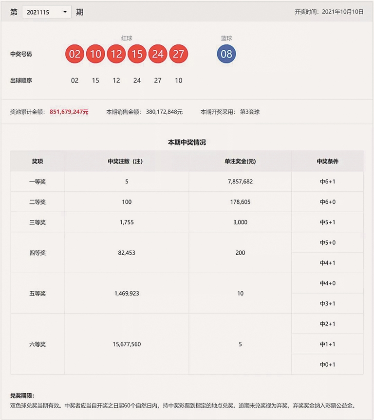 转自中彩网 10月10日晚,中国福利彩票双色球游戏进行第2021115期开奖。当期双色球红球号码为02、10、12、15、24、27,蓝球号码为08。