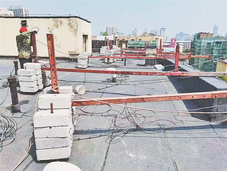 生活报讯 (实习生郭仁凤 记者梁晨文/摄)13日,家住哈尔滨市南岗区铁工街5号2单元7楼的王先生给本报打来电话反映,在老旧小区改造过程中,施工方刚给楼顶做完防水后直接使用吊篮作业,导致他家屋顶多处开裂、屋面渗水。王先生发现情况后联系施工方,但问题始终未解决。