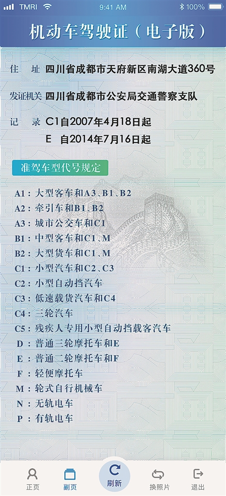 据了解,电子驾驶证由正页和副页两部分组成。其中,正页主要包括驾驶证基本信息、电子证生成时间、用于验证信息的二维码和一维码等内容;副页主要包括驾驶人住址、发证机关、驾驶记录以及准驾车型代号规定等内容。