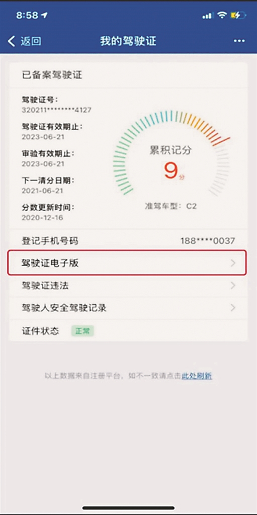 二是实时性。电子驾驶证通过全国公安交管电子证照系统生成,动态显示驾驶证准驾车型变化、交通违法记分等状态,方便实时查询、实时出示、实时核验。