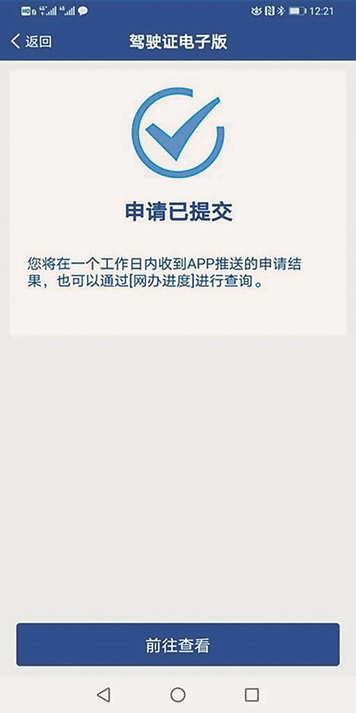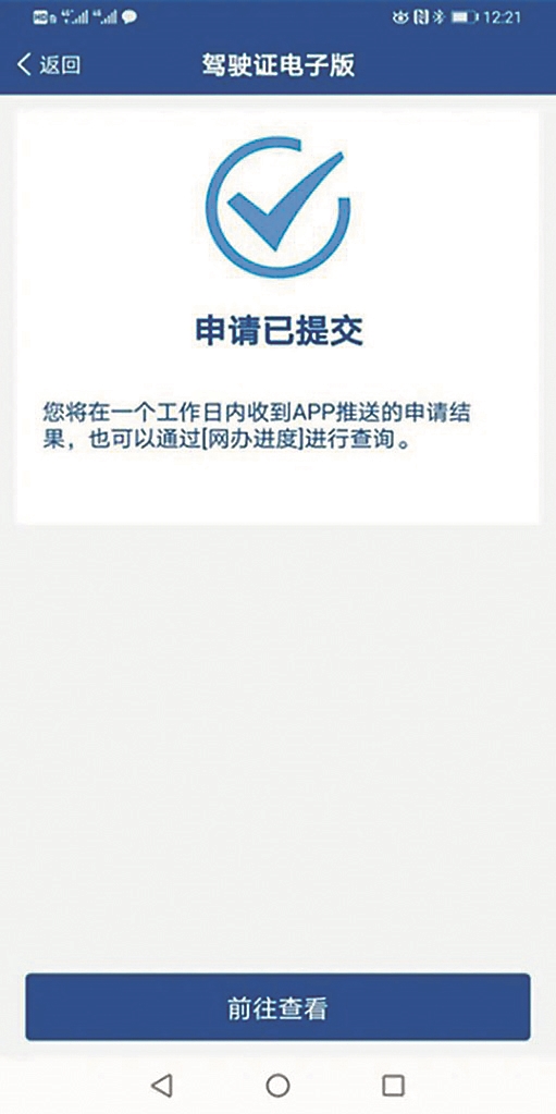 对信息系统无符合要求留存照片的,除拍照方式提交电子照片外,还可以在手机相册中选择证件照片,用于申领电子驾驶证。提交证件照片后,公安机关交通管理部门将在1个工作日内进行审核,对符合要求的,“交管12123”APP将生成电子驾驶证,并推送申请成功信息。