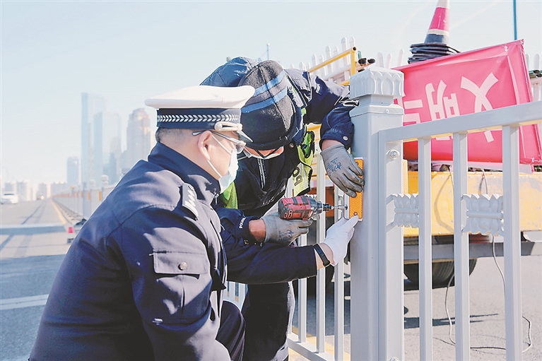 21日10时许,交警部门带领施工队伍在友谊西路沿线,对新增设的交通护栏进行检修和维护,并对移动的护栏底座采取加装固钉,对松动的灯具进行固定,确保交通护栏起到分隔、阻拦、警示等作用。