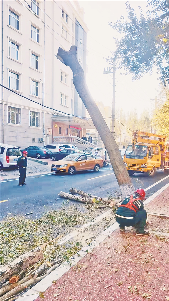 19日,记者联系到了南岗区园林局,工作人员表示:“我们派出专业施工人员去现场查看了,树已经被列为危险树了。因为倾斜导致触碰到了电线,我们需要与电业局共同作业,停电以后才能进行相关作业。电业局工作人员来看过以后表示,只有一段是国家电网,另一段是自营的,这就涉及到了工人带电作业。”经过多方协调,该树已于20日完成伐除,空出的位置将于明年春季补栽。