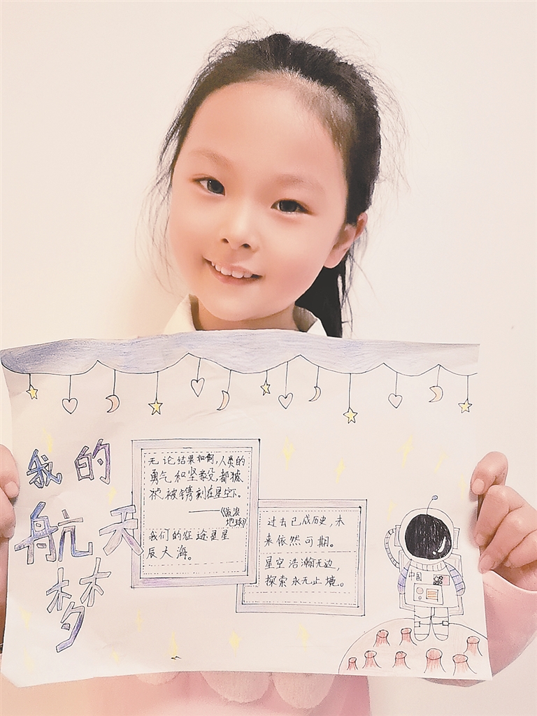 这几天我和妈妈一起查阅了很多关于航天的资料,也了解了我们中国的航天史,每一位航天人的故事都鼓舞着我激励着我,我要向他们致以最崇高的敬意!祝三位英雄早日胜利归来!你们的征途是星辰大海,归来已是春暖花开。