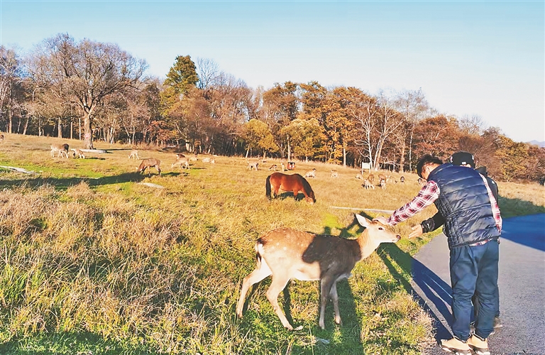 “听说这里散养着1000多只梅花鹿,太好玩了,几根胡萝卜就能和它们亲密互动”“羊驼、矮马、骆驼、小尾寒羊等食草动物十分温顺,都是孩子们喜欢的小动物”“趁着深秋拥抱大自然,感觉太惬意了”……游客们分享着自己的游园感受。