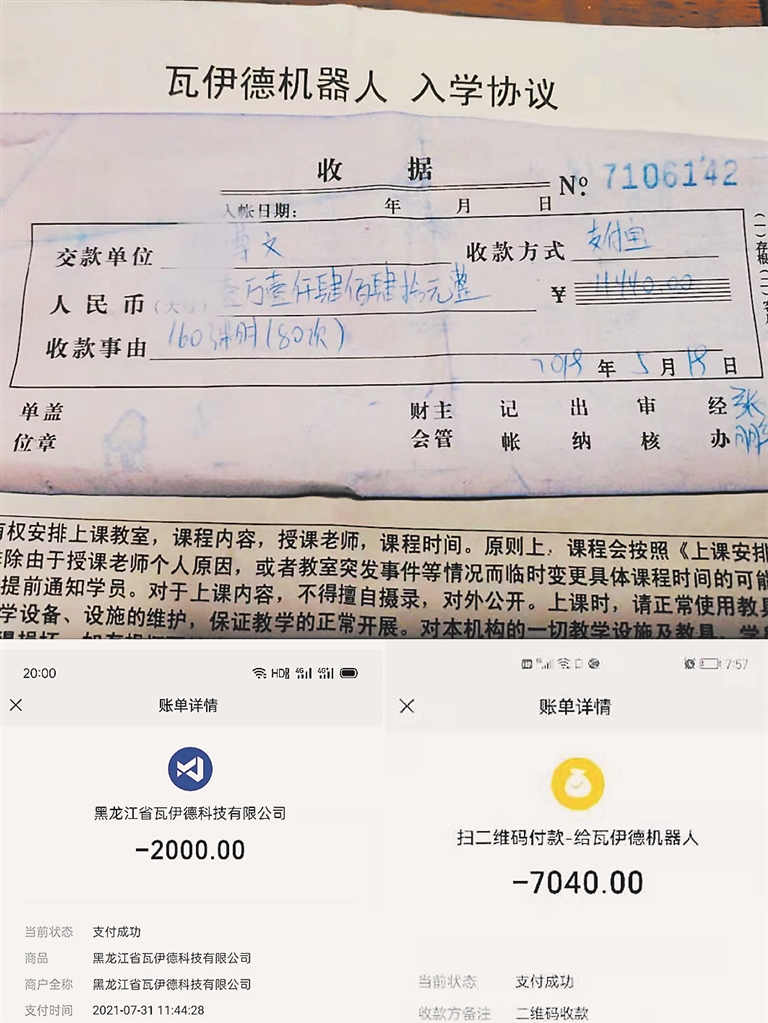 生活报讯 (见习记者崔凯歌 帮办记者吕晓艳文/摄) 近日,哈尔滨市民冯女士联系本报,讲述了她在位于哈尔滨市平房区红旗茂商业城的“瓦伊德机器人”遇到的糟心事。2021年4月,冯女士给孩子买了价值4800元的年卡课程,共48节课,目前还剩32节课没上。2021年7月,“瓦伊德机器人”的老师在家长群里通知因为疫情停课,9月,原本热闹的店面人去楼空,负责人微信拉黑、电话不接,想退费但无人受理。平房店的近百位家长和冯女士一样,未上课的款项少则数千元,多则近万元,面对店家的互相推诿与再三拖延,家长们束手无策,退费之路困难重重。