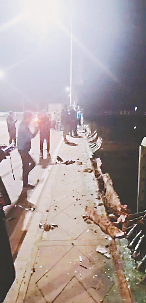 27日晚,当地市民发朋友圈称:“今晚出交通事故了,有台车撞破一溜护栏,掉江里了,正在救援中。”记者从一段视频看到,一段桥的护栏边被撞受损,中间的护栏已经不见,桥上有多辆特警车,有人在维护交通秩序。