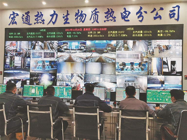 28日,生活报记者来到宏通热力生物质热电分公司看到,一眼望不到头的秸秆垛堆在大院内,高耸入云的烟囱正冒着青烟。三楼集控室内,监视画面区域呈现十余个场景,上演着秸秆逐渐“变身”为热、汽、电的过程。据公司负责人李建伟介绍,这里产生的热量直接并入大网,电力直接汇入国家电网,产生的工业蒸汽也可以供给附近企业用于生产用汽。