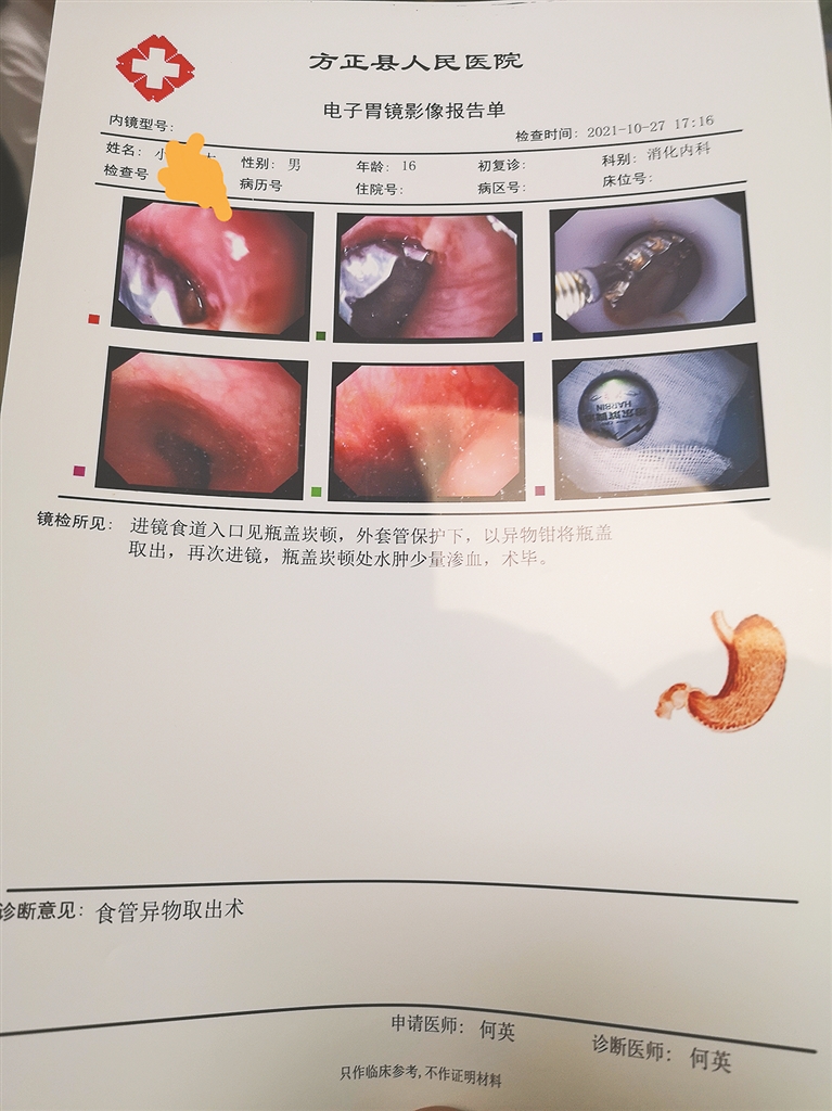 考虑到小王病情危急随时会出现意外,何英与张肖杰立即行动,携带专用设备和相关仪器,火速赶往200多公里外的方正县。经过3个多小时的车程,到达时已近27日18时,何英、张肖杰立即换上防护服进入胃镜室对小王进行施救,仅10多分钟就顺利将异物取出。此时,在场人员悬着的心终于放下了。