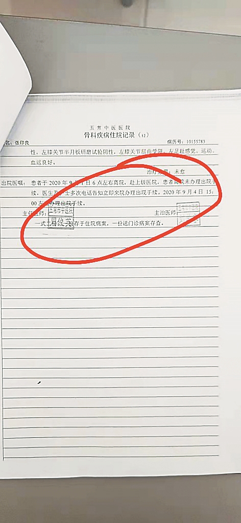 张先生告诉生活报记者,因9月1日转到哈市一家医院就诊,五常中医院将出院日期写成9月4日,两家医院就诊有重复期,导致第二家医院工伤保险结算无法录入系统,无法报销。为此他多次找到五常中医院和五常市卫生健康局沟通解决此事,希望将出院日期改为实际出院日期,但得到的答复是病例无法更改。