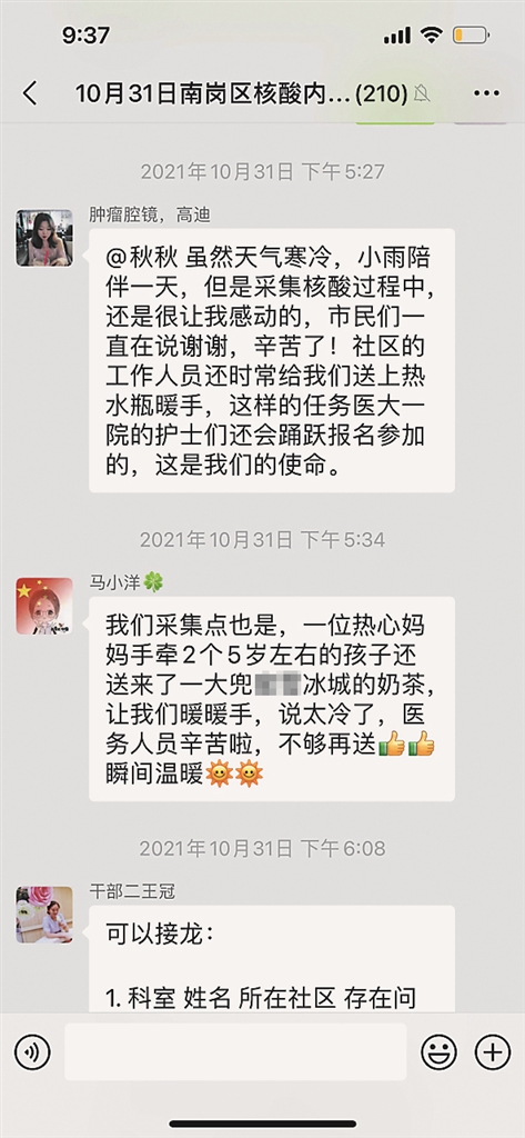 生活报讯 (实习生师琳 记者周琳) 抗疫的号角再次吹响,许多“白衣战士”再次来到一线,在冷雨中奋战在南岗区的各个核酸检测点。哈医大一院门诊中心手术室的护士马春洋就是其中的一位。10月31日,她正在先锋路社区奔马汽配城采样点进行核酸检测工作,可一名女子的举动,却让她在寒冷的天气中感到了温暖。