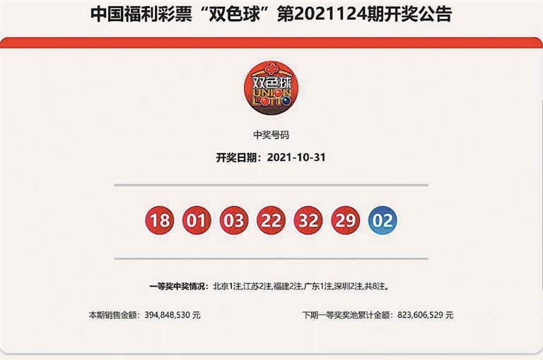10月31日晚,中国福利彩票双色球游戏进行第2021124期开奖。本期双色球红球号码为01、03、18、22、29、32,蓝球号码为02。