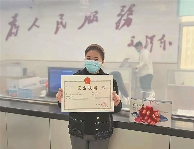 谷静从工作人员手里接过企业开办大礼包后,兴奋地说:“我见证了‘哈尔滨速度’,在疫情情况下,从网上提交材料到拿到营业执照及政府免费刻制的公章和税务UKEY大礼包只用了不到两个小时,通过办理营业执照,我深切感受到商事登记改革带来的便利,体会到哈尔滨市营商环境的优越性。”