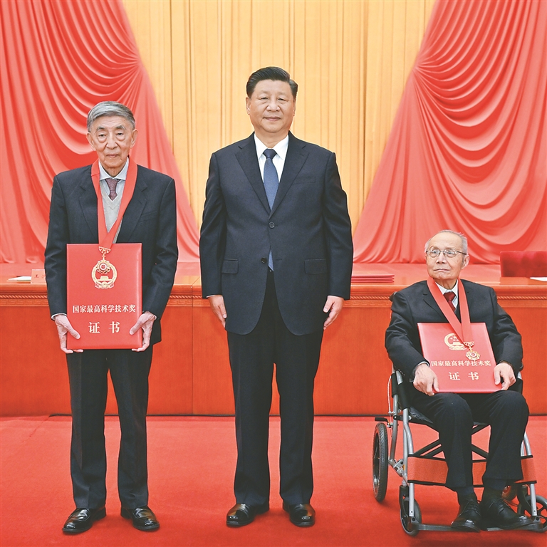 11月3日,2020年度国家科学技术奖励大会在北京人民大会堂隆重举行。中共中央总书记、国家主席、中央军委主席习近平向获得2020年度国家最高科学技术奖的中国航空工业集团有限公司顾诵芬院士(右)和清华大学王大中院士(左)颁奖。新华社记者 李学仁 摄