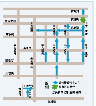 具体事宜如下:南八道街(南勋街至丰润街),只准许由南勋街往丰润街单向通行;南九道街(太古街至靖宇街),只准许由太古街往靖宇街方向单向通行;北九道街(靖宇街至地灵街),只准许由靖宇街往北地灵街方向单向通行;北十道街(友谊东路至地灵街),只准许由友谊东路往地灵街方向单向通行;南十道街(靖宇街至南勋街),只准许由靖宇街往南勋街方向单向通行;南十二道街(南勋街至靖宇街),只准许由南勋街往靖宇街方向单向通行;北十二道街(靖宇街至友谊东路),只准许由靖宇街往友谊东路方向单向通行;北十二道街(钱塘街至江畔路),只准许由钱塘街往江畔路方向单向通行;小南阳巷(德胜街至南七道街),只准许由德胜街往南七道街方向单向通行;小保定街(保障街至小南阳巷),只准许由保障街往小南阳巷方向单向通行;地灵街(北十二道街至北七道街),只准许北十二道街往北七道街方向单向通行;北十二道街友谊东路至钱塘街改为双向通行。