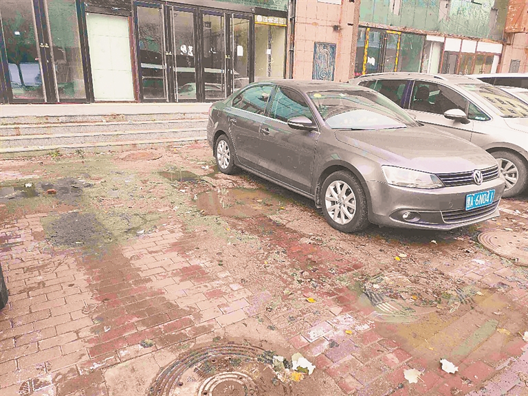 当日记者来到南马路68号看到,在公交站台前车行道边,积水顺着路边不停地流,路的低洼处,积水已经形成了小水坑。在这个站台等车的人很多,记者看到,积水的路面,正是公交车进站时要经过的地方,经常有车进站,不小心压到水坑,把这些水溅到公交站台上。如果车速稍快,就会溅到等车的人的身上。记者沿着路上的水向人行道上走,在人行道边,居民楼下看到,两个水井周围全都是脏东西,水顺着井的边缘不停地向外返。因为水井返水已经有一段时间,水井周围的地面上全都是脏东西,走到近处就能闻到一股臭味。