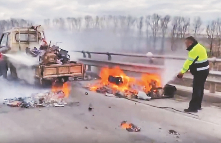 生活报讯 (见习记者王伟健 记者黄迎峰) 拉载纸壳废品的三轮车路上突然起火,紧急情况下,巡逻民警发现后连忙帮助灭火……日前,在G333国道上就发生了这样的一幕。