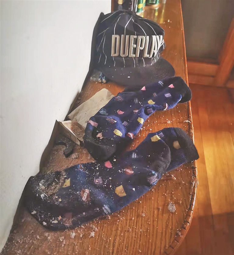 记者在于先生提供的照片和视频中看到,屋内很多地方已经裸露出灰色的墙体,白色墙面的渗水位置变得微微发黄,斑驳不堪。掉落的墙漆碎末则出现在桌子上、衣架上、地上等位置。“现在家里还有股很大的霉味。”于先生说道。