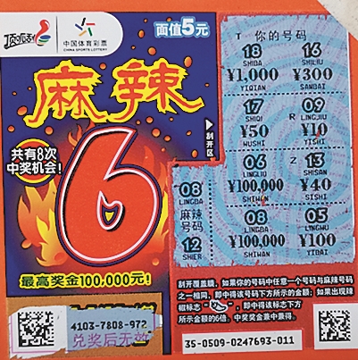 孟先生是在位于大庆市萨尔图区绿色家园的2309009161体彩网点中奖的。据了解,他平时喜欢购买面值20元的体彩顶呱刮即开票,当天他的钱包里正好有些零钱,就花15元买了3张“麻辣6”,没想到其中一张就中了10万元头奖。