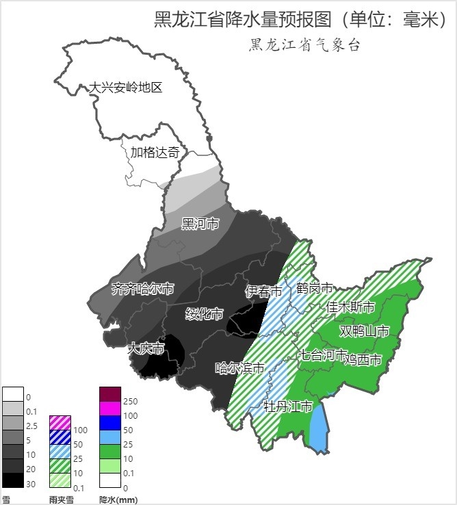 据黑龙江省气象台发布的信息:7日夜间至10日我省将出现暴雪、雨雪冰冻、大风天气,7日夜间以雨或雨夹雪为主,8日以后以降雪为主,中西部地区有暴雪到大暴雪、局地特大暴雪,中部地区将出现冻雨或雨夹雪转雪。此次过程持续时间长、影响范围广、降雪量大、灾害种类多,有冻雨、湿雪、暴风雪、道路结冰,部分地区降水量可能接近或突破历史同期极值。