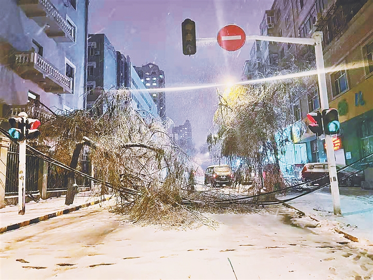 生活报记者从哈市园林部门了解到,8日,哈市降雪转为雨夹雪,因气温逐步降低,树木形成厚厚的冰挂。哈市有些树木尚未完全落叶,突遇冻雨,树冠及枝干上端“体重”增加,枝干、树根无法承受重量,最终导致个别树木折枝、劈叉或倒伏,其中,杨树、柳树还未完全落叶,受冻雨影响严重。