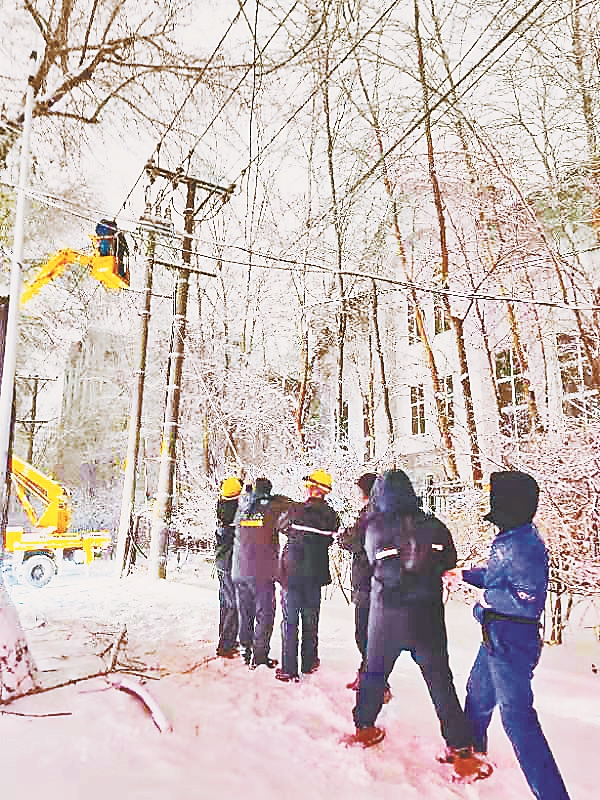 8日,该公司接到用户故障报修,位于哈市松北区世茂滨江新城法兰西风情园小区10千伏世茂甲线由于受雨雪冰冻天气影响,树木严重覆冰并倾倒。倒塌的树木对线路造成挤压发生线路短路,小区四栋居民楼用电受到影响。该公司第一时间组织抢修人员到达现场。在现场,抢修人员一边紧急调运物资和车辆,一边与园林部门共同将搭挂线路的树枝进行清理。清理后,为尽快恢复供电,抢修人员在雨雪中经过一个多小时的奋战,对故障点两侧线路进行摘引,22时20分,排除故障恢复供电。