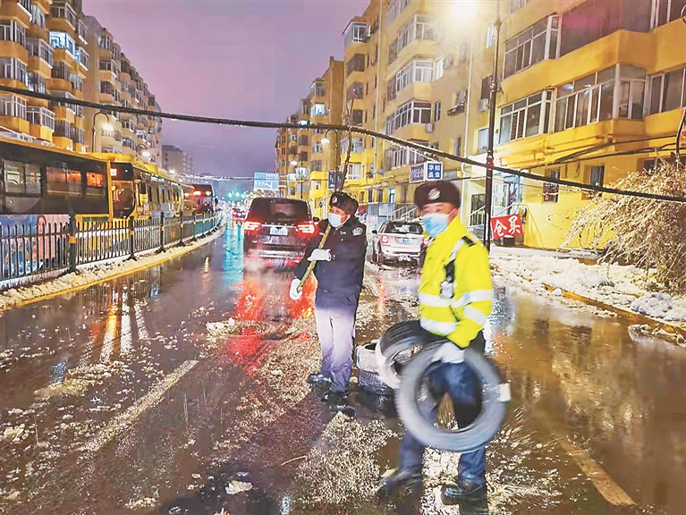 8日16时20分,哈市道里交警大队五中队队长关云祥和民警赵超驾驶警车巡逻,当巡逻到地工街、铁顺街附近时发现这两条街堵得水泄不通。原来在地工街与地正街交口附近,一棵大树倒在路旁,顺势把三根电缆线刮落,电缆垂落在距离地面不足半米的位置,把双向四车道横向拦断。“找点树枝,咱俩把电缆支起来!”说着,关云祥和赵超在路旁找到两段断树枝,将三根电缆线捋在一起,支过头顶。可是,这样的高度只能允许小型车辆单排通过。而地工街沿线有十多条公交线路,很多大公交车在此滞留。在路旁,正好有一家修车行,他们跟修车师傅借了六个车轮胎,分成两组垫在两人脚下。二人再次用树枝支起电缆,这样的高度勉勉强强让连续的四台公交车通过。而此时,关云祥和赵超从头到脚,棉衣、棉裤到袜子早已湿透,双手和手臂一直在发抖。就在此时,关云祥耳边传来声音:“来,给我们举一会儿”,刚刚通过的四台公交车司机,停好车后折返了回来。四位公交车师傅,接过关云祥和赵超手里的树枝,站在轮胎上,继续支起一条路。腾出手来的关云祥、赵超连忙指挥车辆慢行通过。