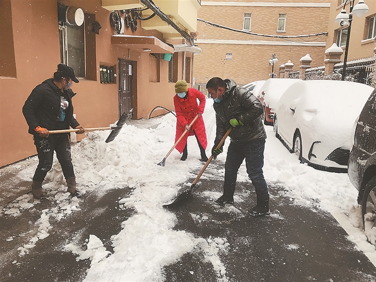 10日,随着冰城连夜的降雪,地上的冰雪越发结实了起来。付丽梅8点像往常一样去执勤点值守,10点多回家去洗手间的时候听见楼下有“沙沙”的声音。付丽梅探头从窗户往下一看,发现社区来了两个工作人员进行清雪。虽说之前,付丽梅和几位居民把小区和单元门口清出来一条路,但路面又结冰了。