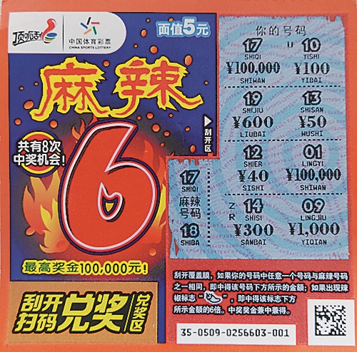作为体彩顶呱刮即开票的忠实粉丝,Z先生中奖后非常激动。“我平时喜欢刮面值30元的‘大吉大利’,没想到这款经典的‘麻辣6’竟给我带来10万元的幸运,以后我还会继续支持体彩和公益事业”。
