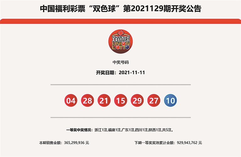 转自福彩双色球微信公众号 11日晚,中国福利彩票双色球游戏进行第2021129期开奖。本期双色球红球号码为04、15、21、27、28、29,蓝球号码为10。