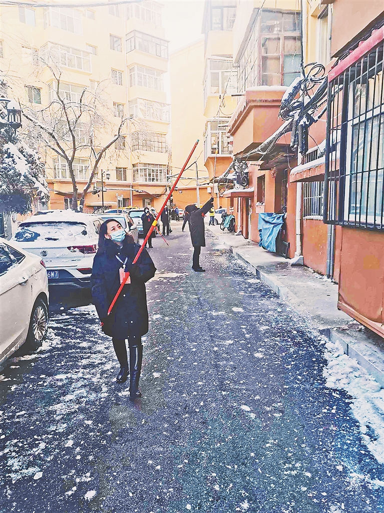 12日下午,哈尔滨市道里区安静街道办事处安松社区,组织志愿者、热心居民和下沉到社区的哈市纪委的党员干部一起,开展了联合清理冰溜子行动,大家有拿竹竿的,有拿扫帚、铁锹的,在清除院内积雪的同时,挨个单元和门洞清理正在融化的冰溜子。