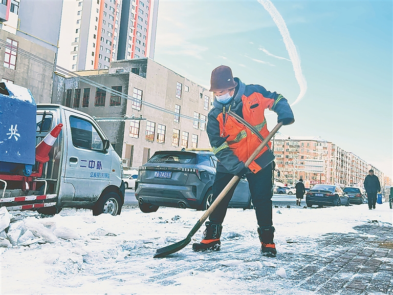 生活报讯 (记者李丹文/摄) 8日凌晨2点,哈市道外区城管局清扫保二队大寨小队小队长耿玉凤摸黑起身,在微弱的厨房灯光下,她用刚烧开的水泡了五片饼干,趁着热乎劲儿囫囵吞下,紧接着穿上绒衣、棉衣、工作服,右手一捋头发,戴上围巾和帽子,出发迎战冰雪。
