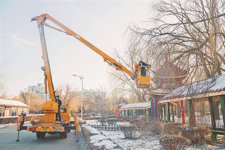 生活报讯 (记者李丹文/摄) 哈尔滨市城管局园林绿化中心提前部署应对暴风雪天气各项措施,消除可能存在的安全隐患。全市各大公园再次启动全园紧急排查,预判前期冻雨灾害的树木折损情况和潜在危险,对于可能存在危险或者安全隐患的区域及时设置局部围挡。